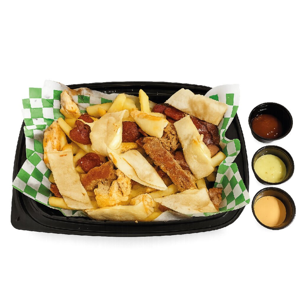 Deliciosas tiras de arrachera y pechuga de pollo a la plancha acompañado de sachicha ahumada, trozos de tocino, quesadillas con queso derretido, papas a la francesa y dos salsas a elegir.