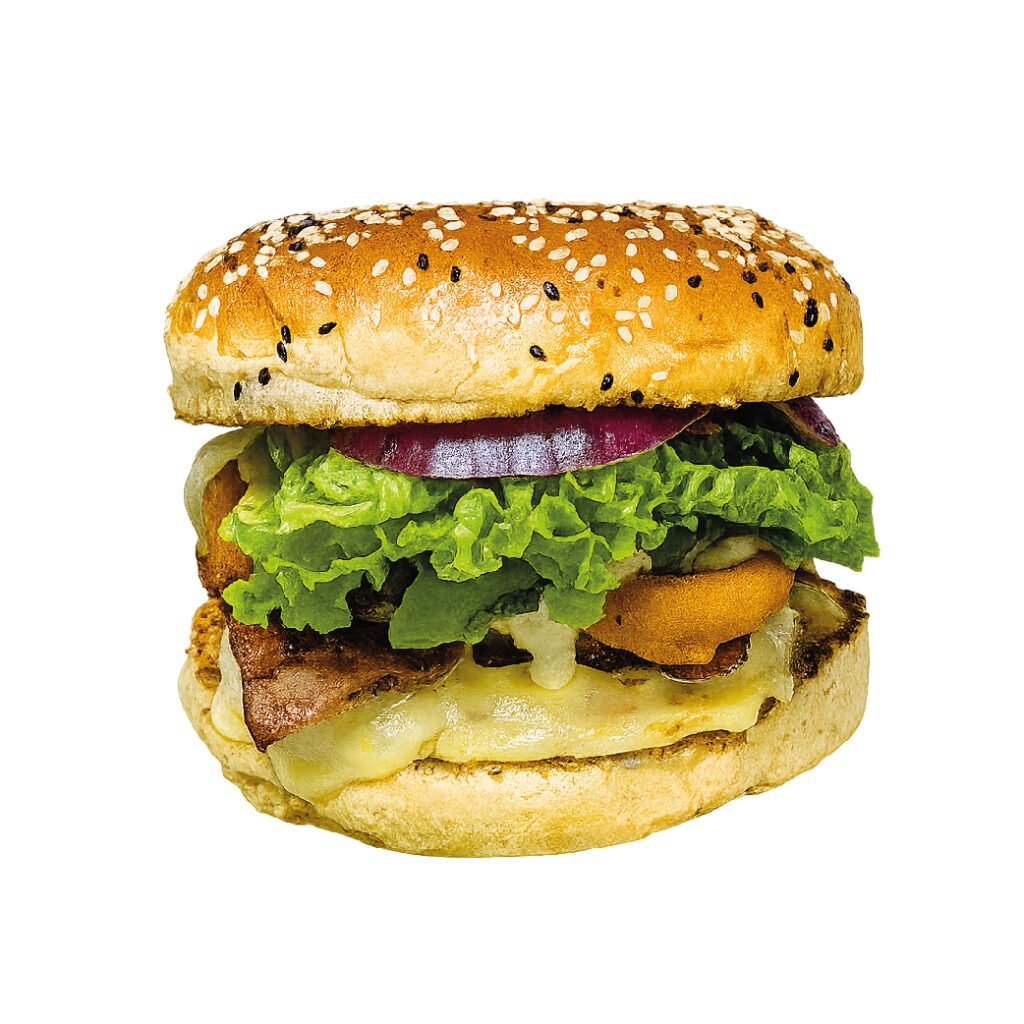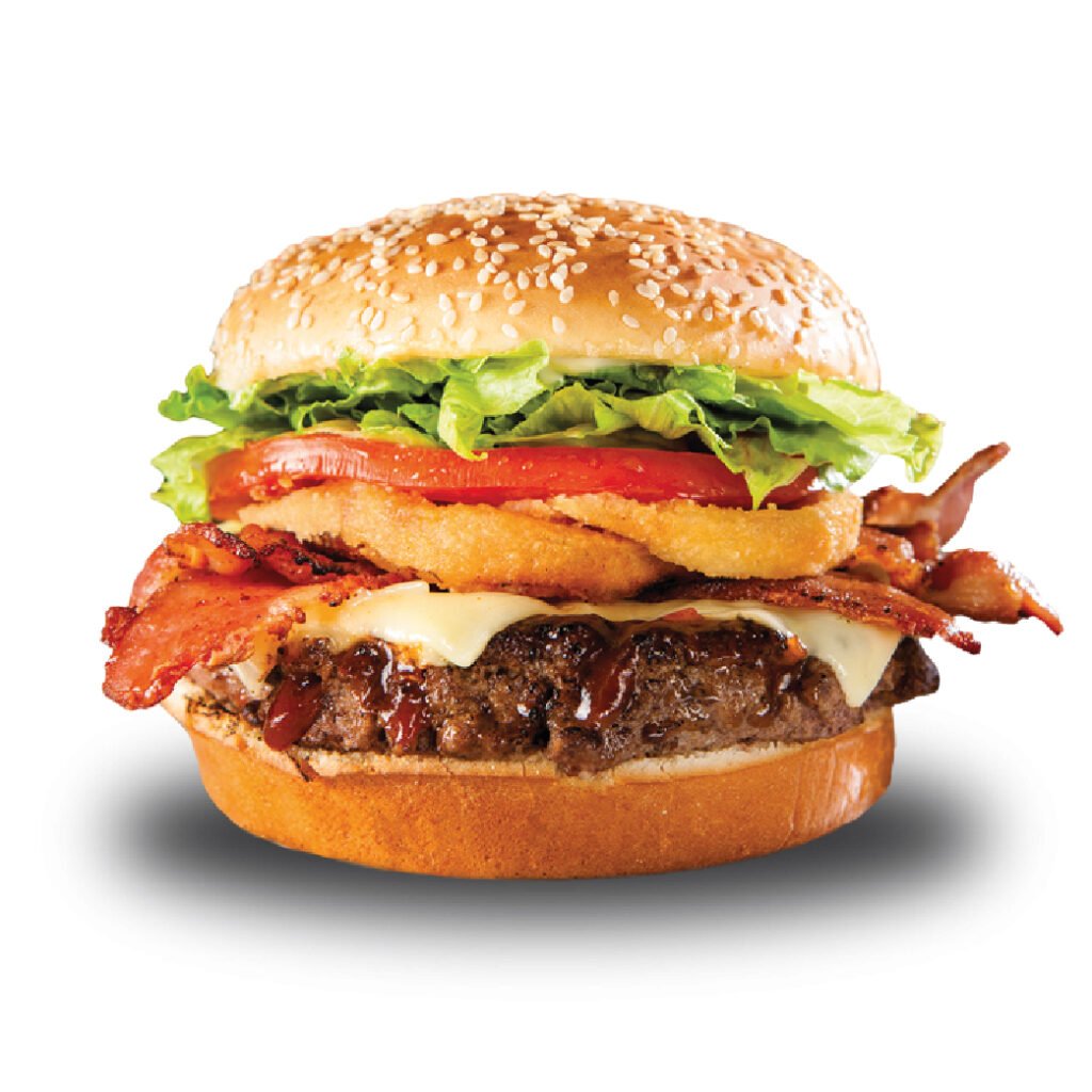 Pan tierno, carne de res, queso, tocineta, lechuga, tomate, aros de cebolla, salsas de la casa.
