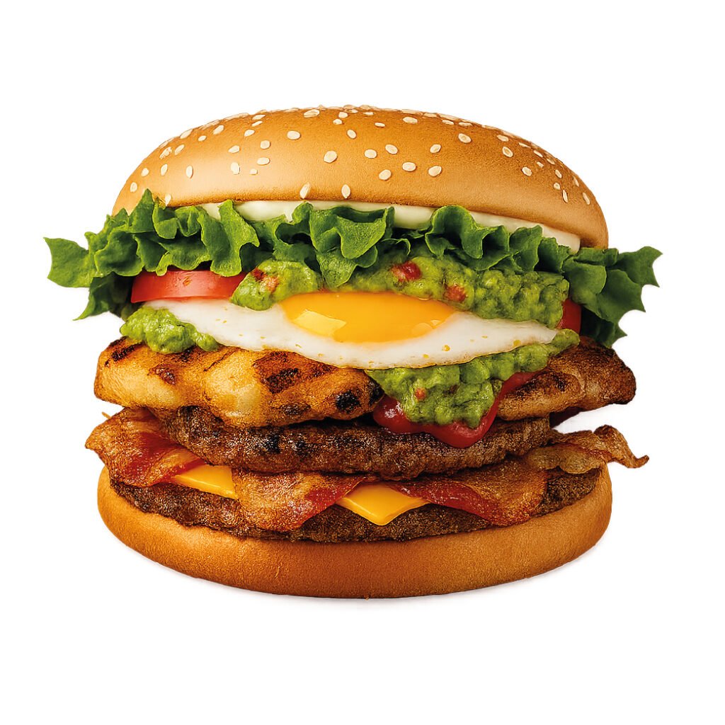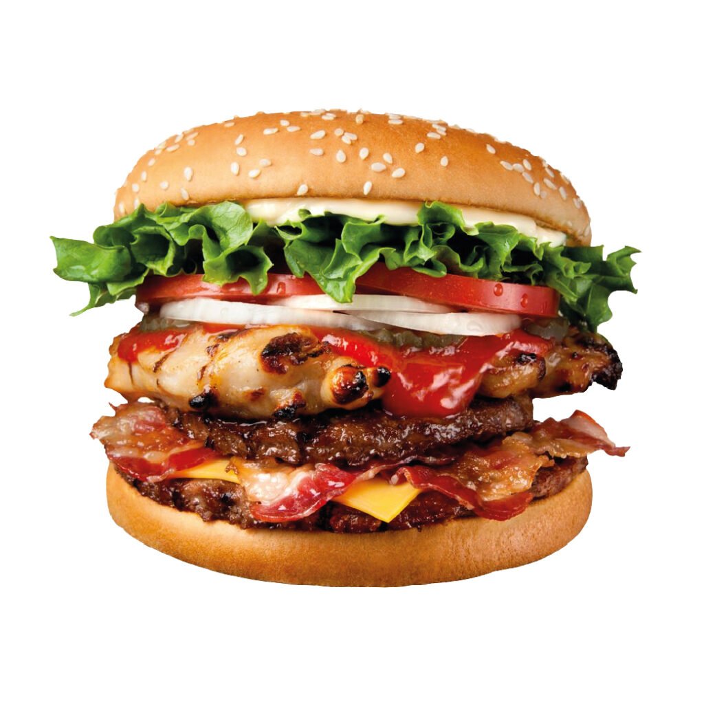 Pan tierno, carne de res, pollo a la plancha, queso, mermelada de tocino, lechuga, tomate, aros de cebolla, salsas de la casa.