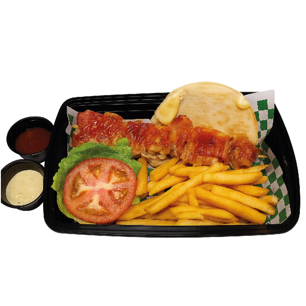 Deliciosos trozos de pernil de pollo envuelto en tocino a la plancha, papas a la francesa quesadilla con queso derretido, lechuga fresca y tomate, con 2 salsa a elegir.