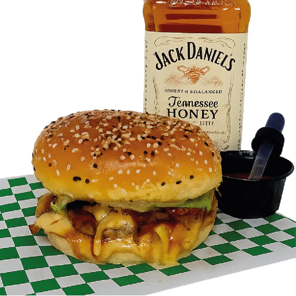 Pan tierno, carne de res, piña asada al whisky, tocino en salsa jack daniels, queso, lechuga, tomate, cebolla grille, salsas de la casa. shot de whisky en gotero 3ml.
