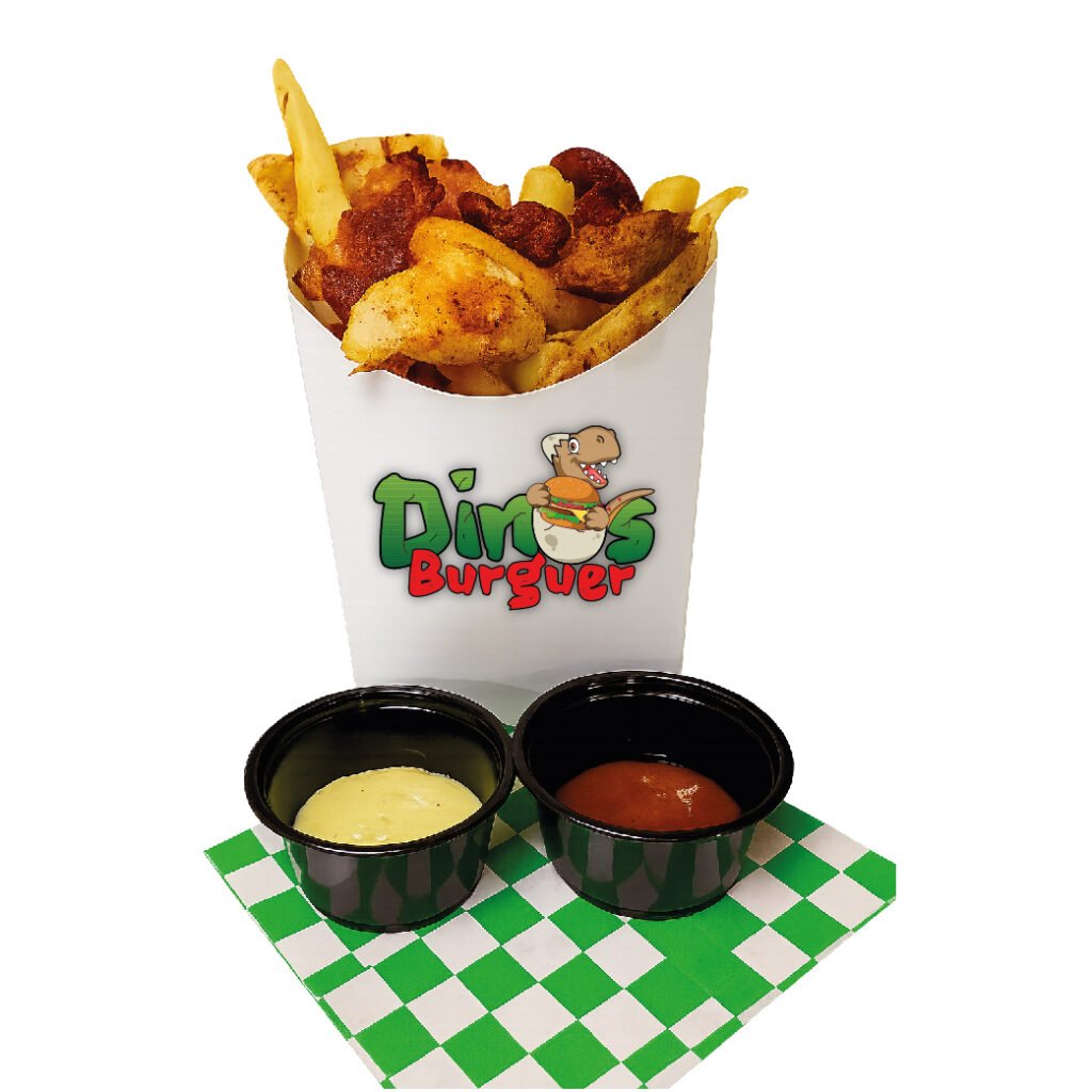 180 Gramos de papas a la francesa, con sasodador a elegir, y 1 salsa a elegir